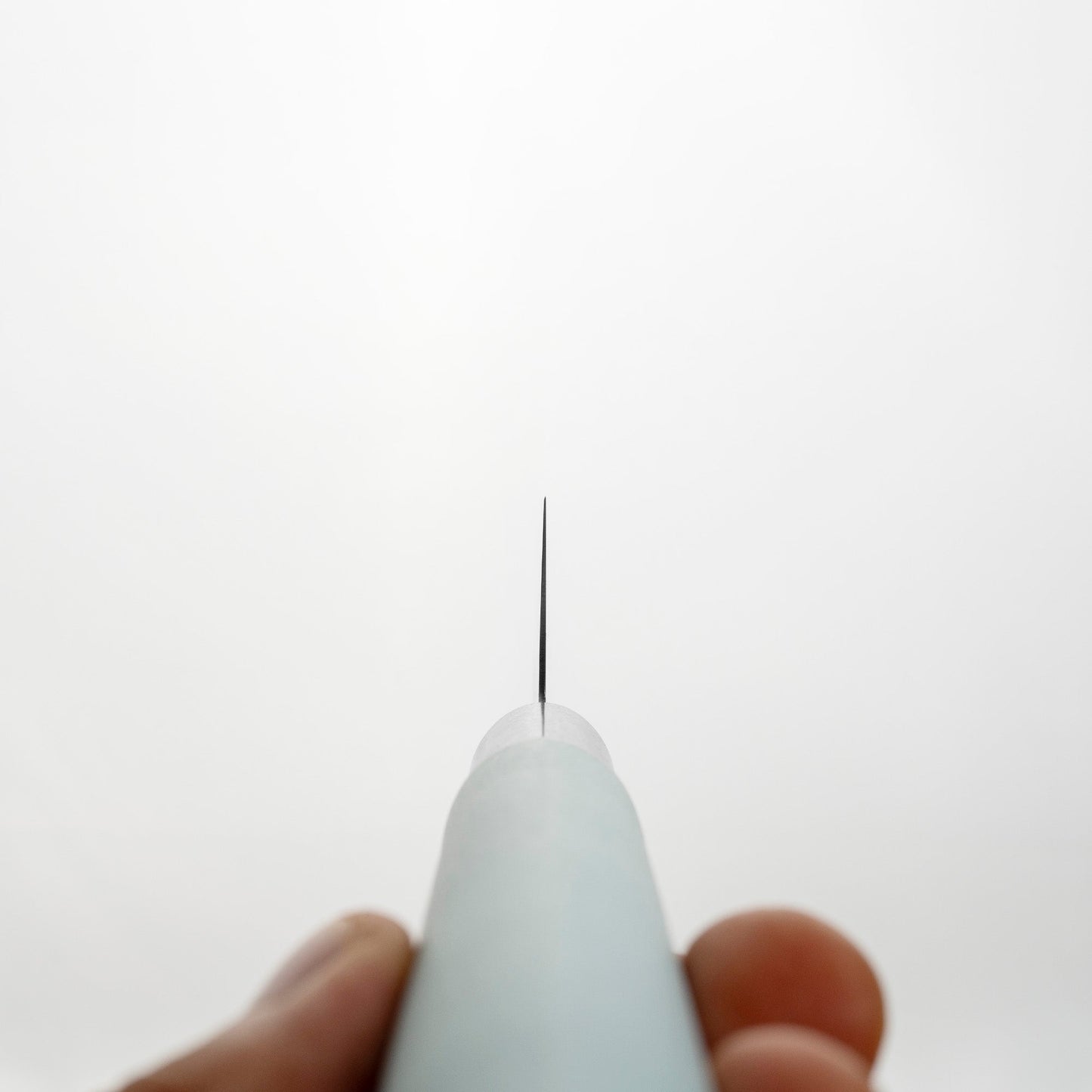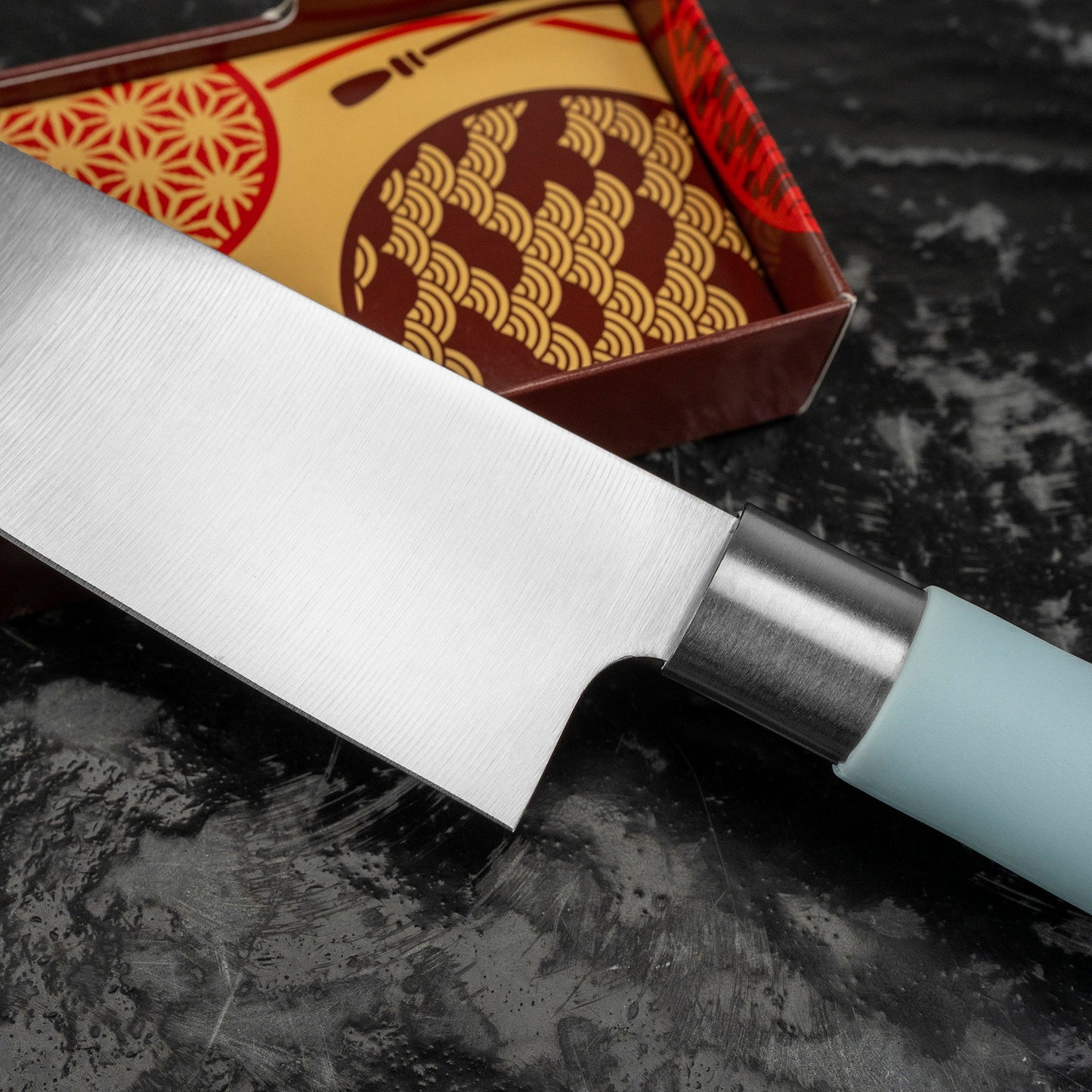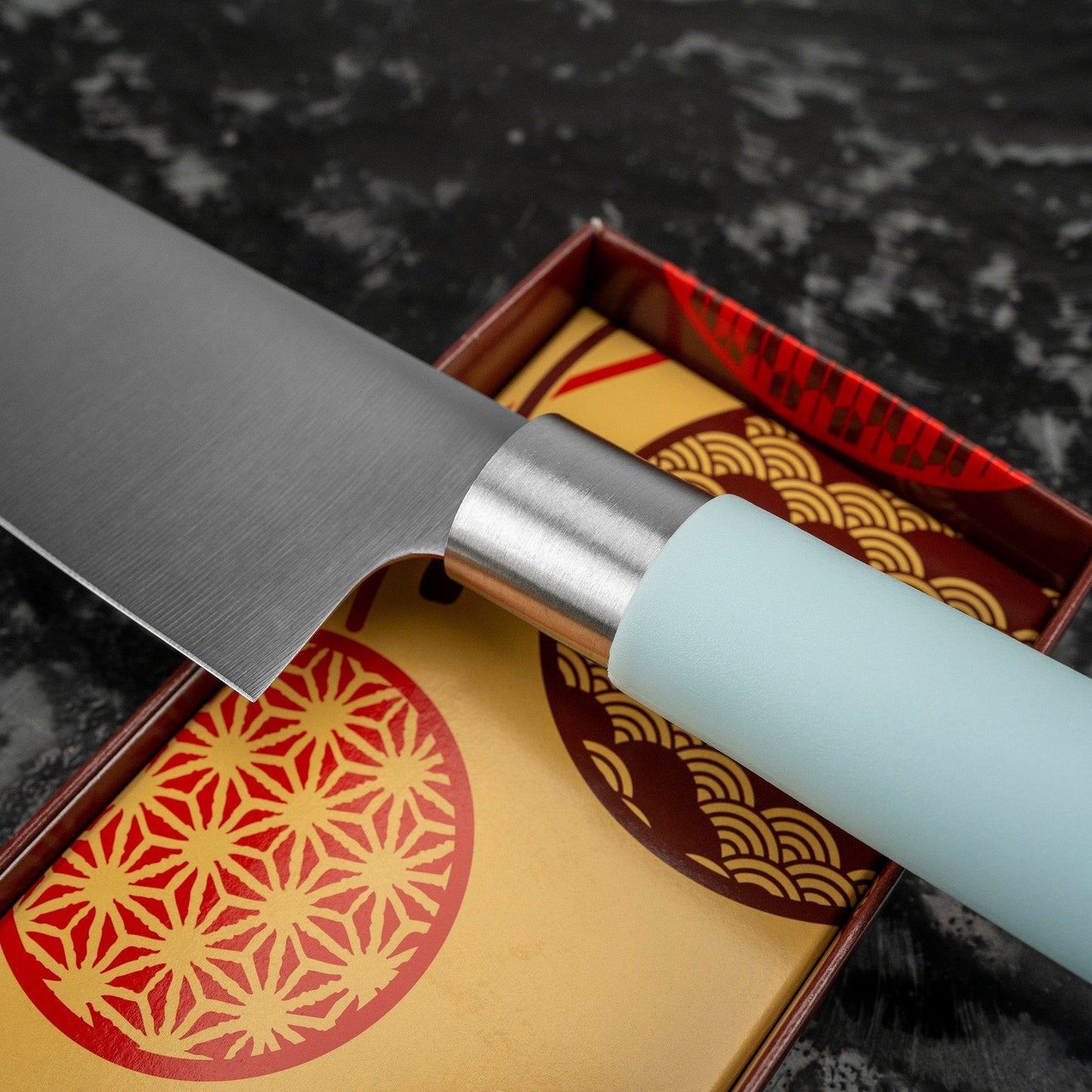 Japonský nůž ze série Macaron, určený pro krájení zeleniny a ovoce. Široká čepel usnadňuje přenášení krájených produktů. Vysoká rukojeť zabraňuje nárazům o prkénko. Díky své velikosti je nůž Santoku ideální pro krájení velkých produktů, jako je meloun nebo zelí.