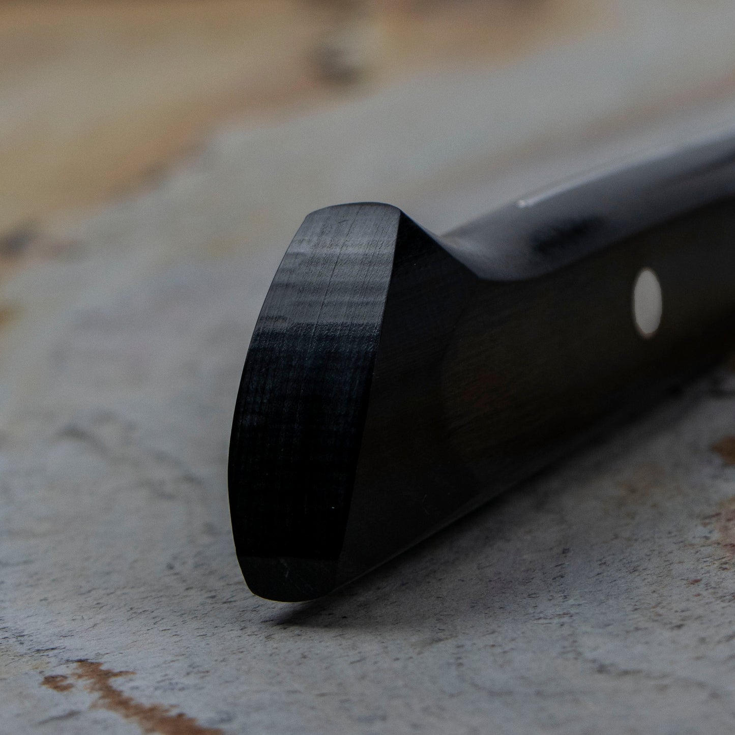 Určeno pro krájení zeleniny, ovoce, masa a ryb. Široká čepel usnadňuje přenášení krájených produktů. Vysoká rukojeť zabraňuje nárazům o prkénko. Díky své velikosti je nůž Santoku ideální pro krájení velkých produktů, jako je meloun nebo zelí.